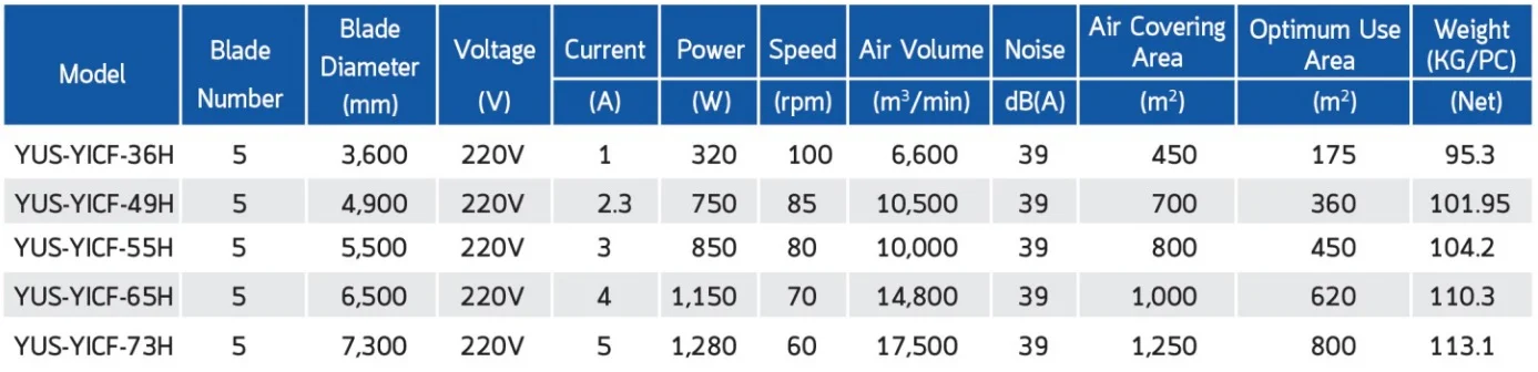 DC BIG FAN 220V model YUS-YICF-H BIG FAN from Yushi is Available in sizes ranging from 3.6 meters to 7.3 meters. Please contact Yushi for assistance and our engineering team can help you select and design the most suitable products for you through every channel.