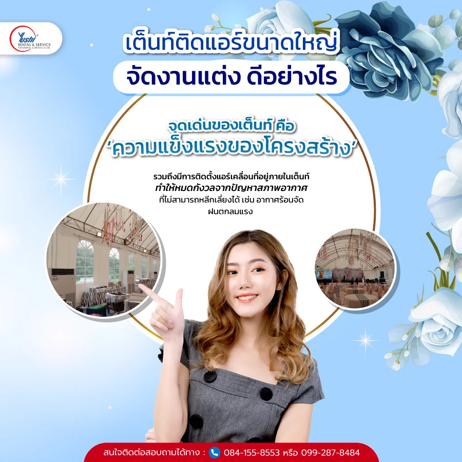 จะเห็นได้ว่าเต็นท์ติดแอร์ขนาดใหญ่ ตอบโจทย์การจัดงานแต่งกลางแจ้ง มากกว่าเต็นท์ผ้าใบธรรมดาทั่วไป เนื่องจากอากาศภายในเต็นท์ถ่ายเทได้ดีกว่าเต็นท์ผ้าใบธรรมดา ไม่ว่าจะรองรับคนเยอะแค่ไหนก็ไม่หวัน หากใครที่สนใจอยากใช้บริการเช่า เต็นท์ติดแอร์ขนาดใหญ่ กับทาง Yushi Rental นอกจากเต็นท์แล้ว คุณจะได้รับบริการในด้านอื่นๆ แบบ One Stop Service ไม่ว่าจะเป็น