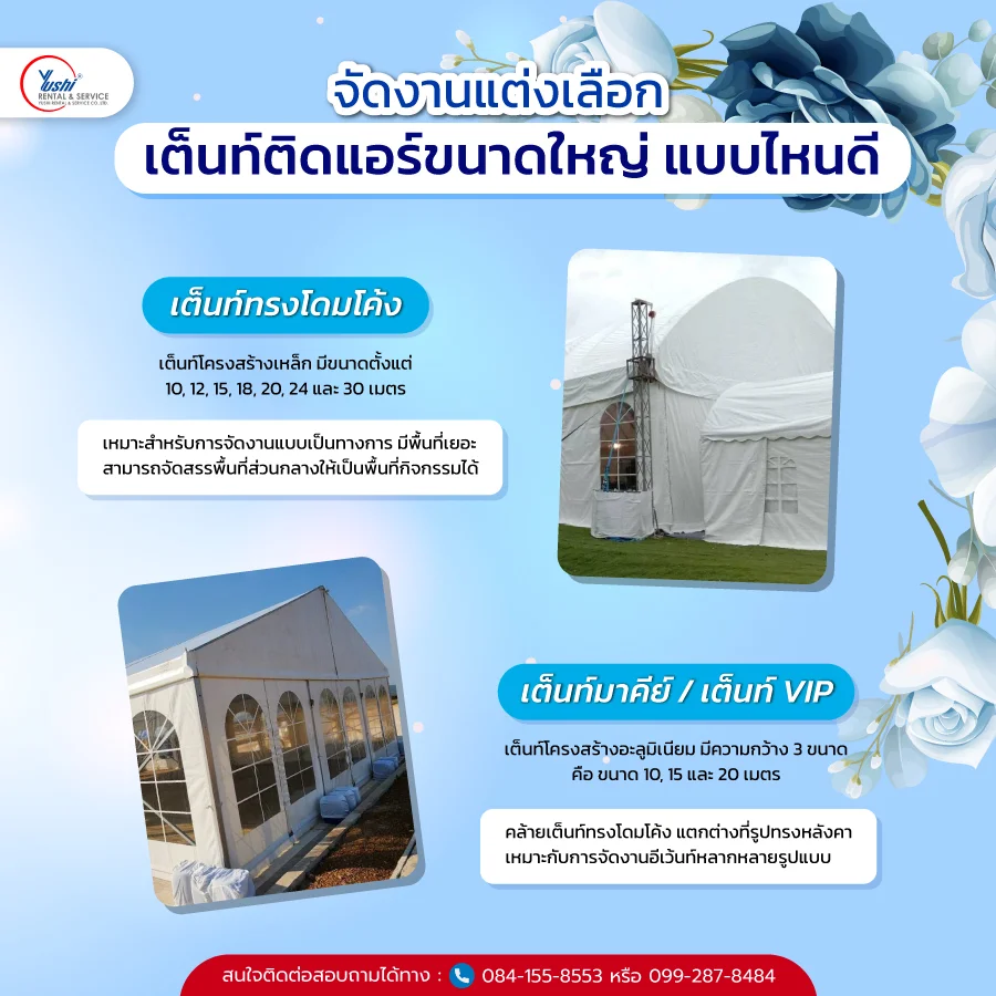 การจัดงานแต่งแบบ Outdoor นอกจากสภาพอากาศแล้ว สิ่งที่ต้องคำนึงถึงอีกเรื่อง คือ การจัดเตรียมพื้นที่ เพื่อรองรับจำนวนแขกที่มาร่วมงาน โดยเต็นท์ติดแอร์ที่ถูกนำมาใช้ในงานพิธีการ มักจะเป็นเต็นท์ติดแอร์ที่มีขนาดใหญ่ และมีหลายรูปทรงให้เลือกใช้งาน หากใครที่ยังไม่รู้ว่าจะเลือกเต็นท์ติดแอร์แบบไหนดี? ในหัวข้อนี้ Yushi Rental มีเต็นท์ติดแอร์ขนาดใหญ่มานำเสนอ เพื่อเป็นตัวเลือกให้กับผู้ใช้บริการ