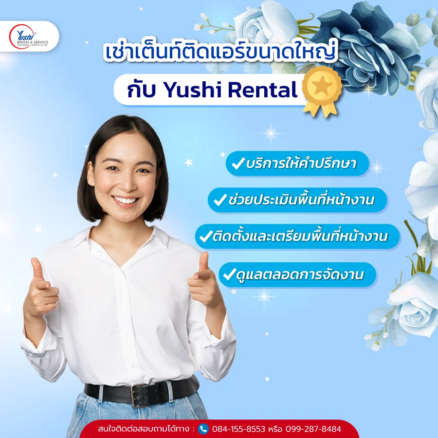 และทั้งหมดนี้ คือ บริการเช่าจากทาง Yushi Rental เพื่อเป็นตัวเลือกสำหรับผู้ที่ต้องการติดตั้ง ฟังก์ชันเสริมภายในงานเพิ่มเติม สำหรับใครที่สนใจ บริการเช่าเต็นท์ติดแอร์ขนาดใหญ่ แต่ไม่รู้วิธีในการเช่า ทางเรามีทีมงานพร้อมให้คำปรึกษา และสำรวจหน้างานให้ฟรี โดยไม่เสียค่าใช้จ่าย