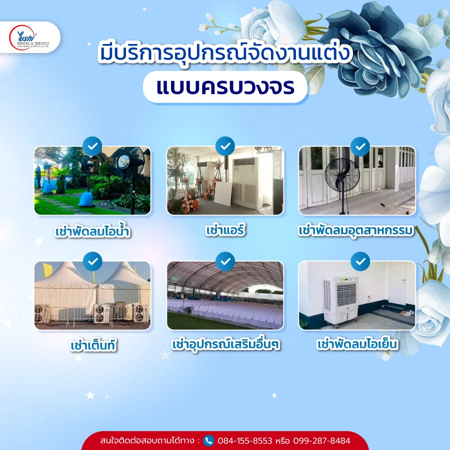เรามีพัดลมไอเย็น, พัดลมไอน้ำ, แอร์, เต็นท์, เก้าอี้, โต๊ะ และอุปกรณ์จัดงานอีกมากมายคอยบริการคุณ พร้อมที่จะช่วยดูแลคุณอย่างครบวงจร มาพร้อมกับการบริการสำรวจหน้างานให้ฟรีที่คุณไม่ควรพลาด