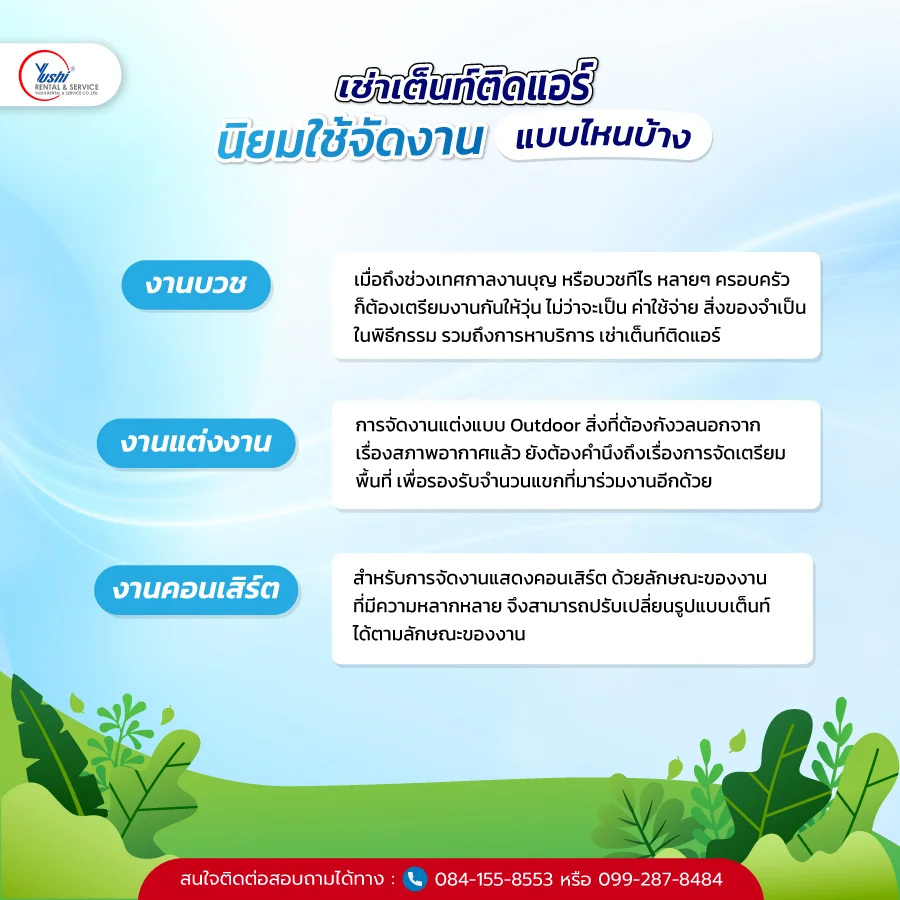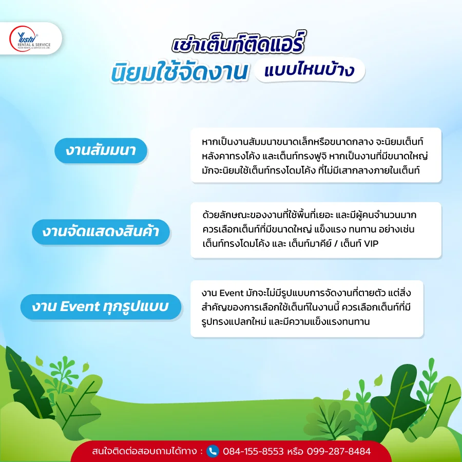 - เช่าเต็นท์ เต็นท์มีให้เลือกหลากหลายขนาด และสามารถเลือกดีไซน์ ตั้งแต่ทรงหลังคา, แบบทึบ, แบบใส, มีหน้าต่าง, รูปแบบประตู, มีแอร์ และอื่น ๆ อีกมากมาย