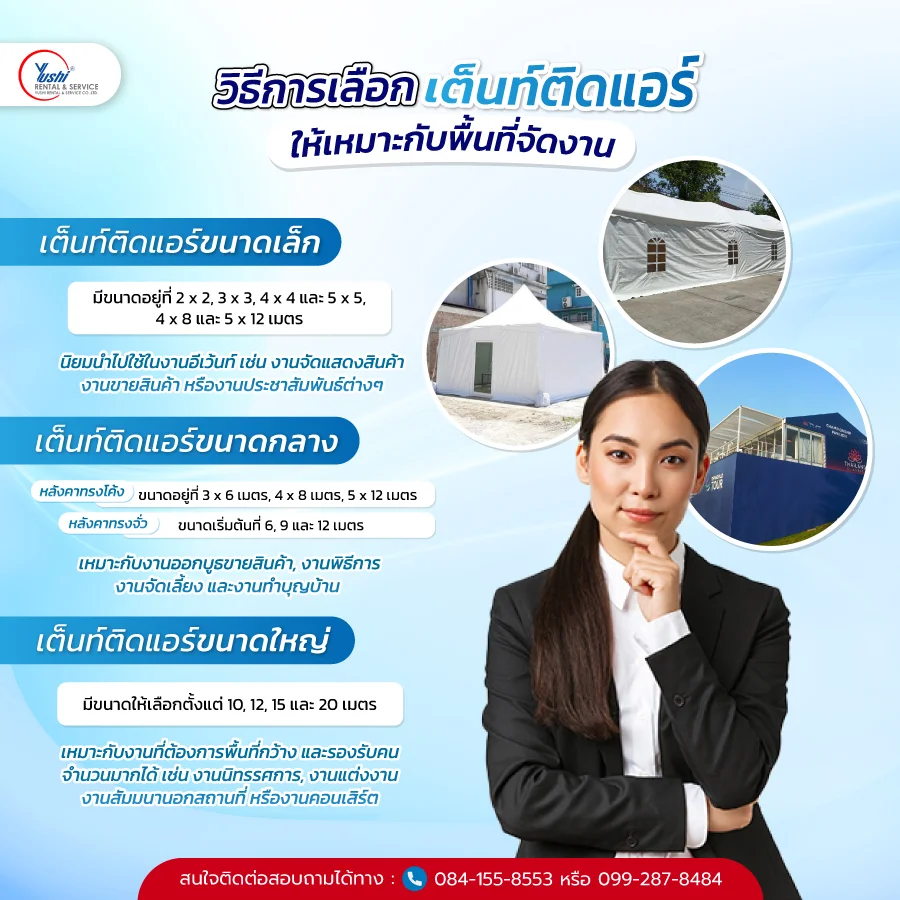 ปัจจุบันเต็นท์ติดแอร์มีให้เลือกหลายรูปทรง หลายขนาด ทั้งขนาดเล็ก กลาง ไปจนถึงขนาดใหญ่ เพื่อให้ตอบโจทย์งานอีเว้นท์ในรูปแบบต่างๆ ได้มากยิ่งขึ้น สำหรับผู้จัดงานมือใหม่ท่านใด ที่ยังไม่เคยมีประสบการณ์ในด้านนี้มาก่อน ในหัวข้อนี้ Yushi Rental จะมาแนะนำวิธีการเลือกเต็นท์ติดแอร์ ให้เหมาะสมกับพื้นที่จัดงาน