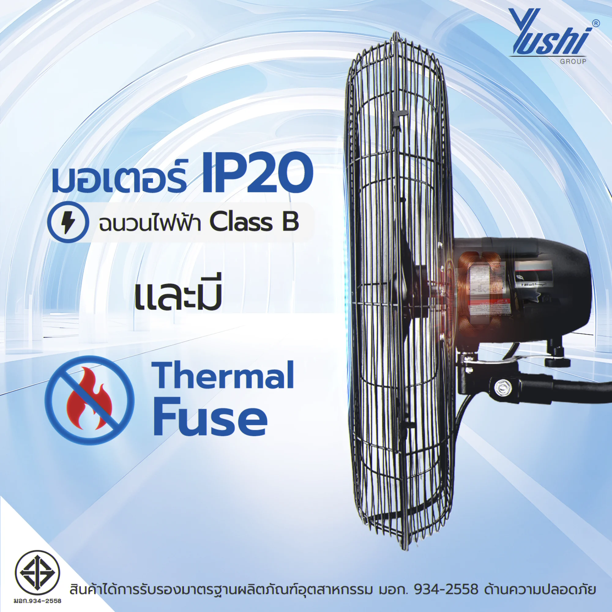 - มอเตอร์ IP 20 ฉนวนไฟฟ้า Class E และมี Thermal fuse ระบบตัดการทำงานอัตโนมัติ กรณีใช้เกินกำลัง ป้องกันการเกิดอัคคีภัย